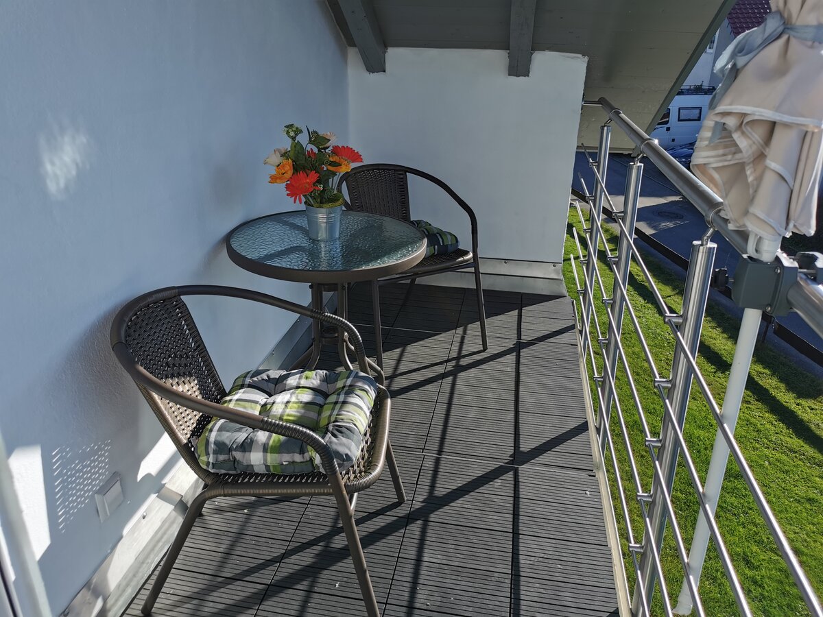Durch das Wohnzimmer direkt auf den gemütlichen Balkon mit Tisch und Stühlen.