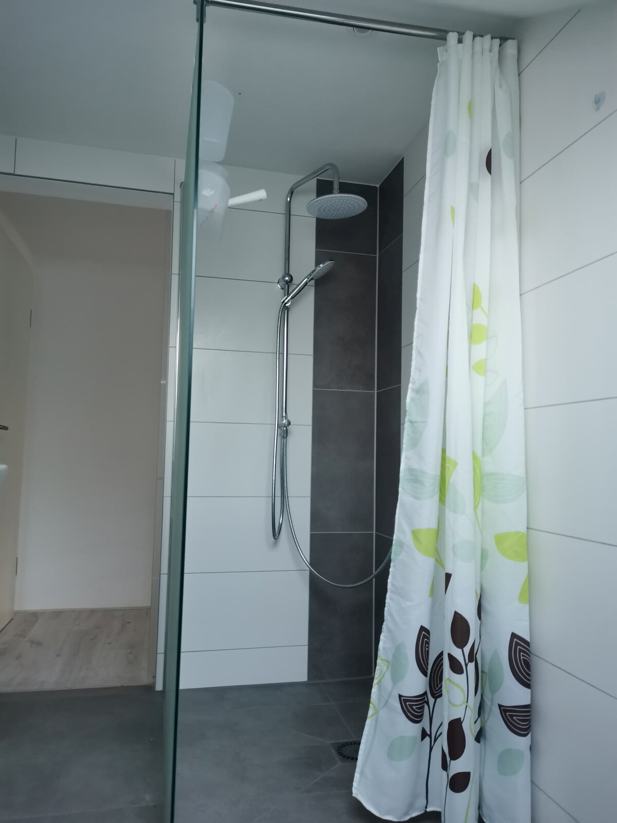 Das Bad hat eine ebenerdige Dusche mit großem Duschkopf, ebenfalls ist eine Waschmaschine vorhanden.